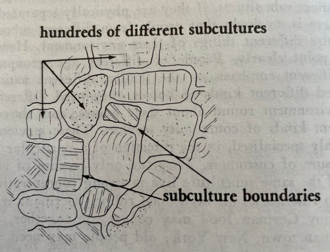 The mosaic of subcultures requires that hundreds of different cultures live, in their own way, at full intensity, next door to one another. But subcultures have their own ecology. They can only live at full intensity, unhampered by their neighbors, if they are physically separated by physical boundaries.